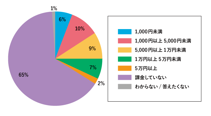 全国平均は12,568円で、第20位・岩手県と第21位・三重県との間の数値です。また、課金している方で多く挙げられた回答は1,000円以上5,000円未満という結果となりました。